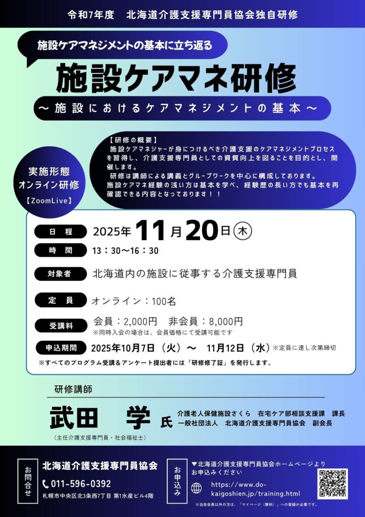 - 施設ケアマネジャーが身につけるべき介護支援のケアマネジメントプロセスを習得し、介護支援専門員としての資質向上を図ることを目的とし、開催します。