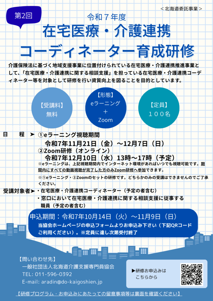 北海道内で「在宅医療・介護連携に関する相談支援」を担うコーディネーター等を対象とした研修を実施します。