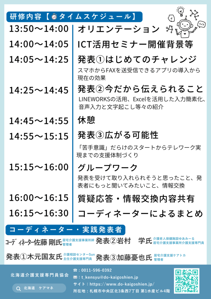 事業内で「ICTの活用・導入」は進んでいますか?本研修は、ICT導入に向けた不安や課題を整理し、チームで円滑な活用を進めるための視点と工夫を実際に導入した事業所から実践報告をいただくことで、「ICT導入の第一歩」を進めることを目的とし開催します。
